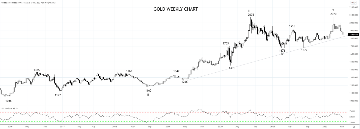 我们在3月18日的文章中将自2070高点以来的反转形态描述为“镊子顶/双顶形态,可能是一个时代的落幕”。另外值得注意的是,黄金完成了艾略特波浪理论中自2015年低点1046以来的5浪上涨行情。