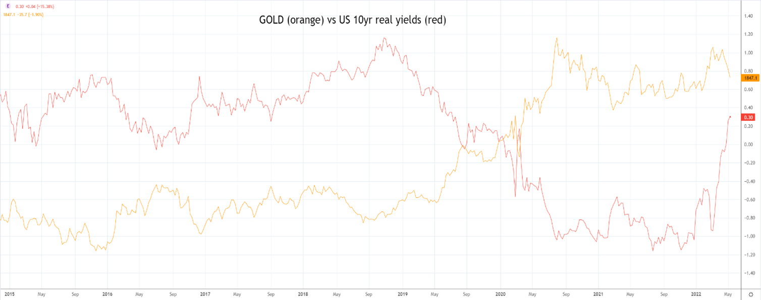 美国10年期真实收益率(经通胀调整后的利率)隔夜收在+30点。值得注意的是,随着真实收益率从负转正,黄金在4月中旬加速下滑。