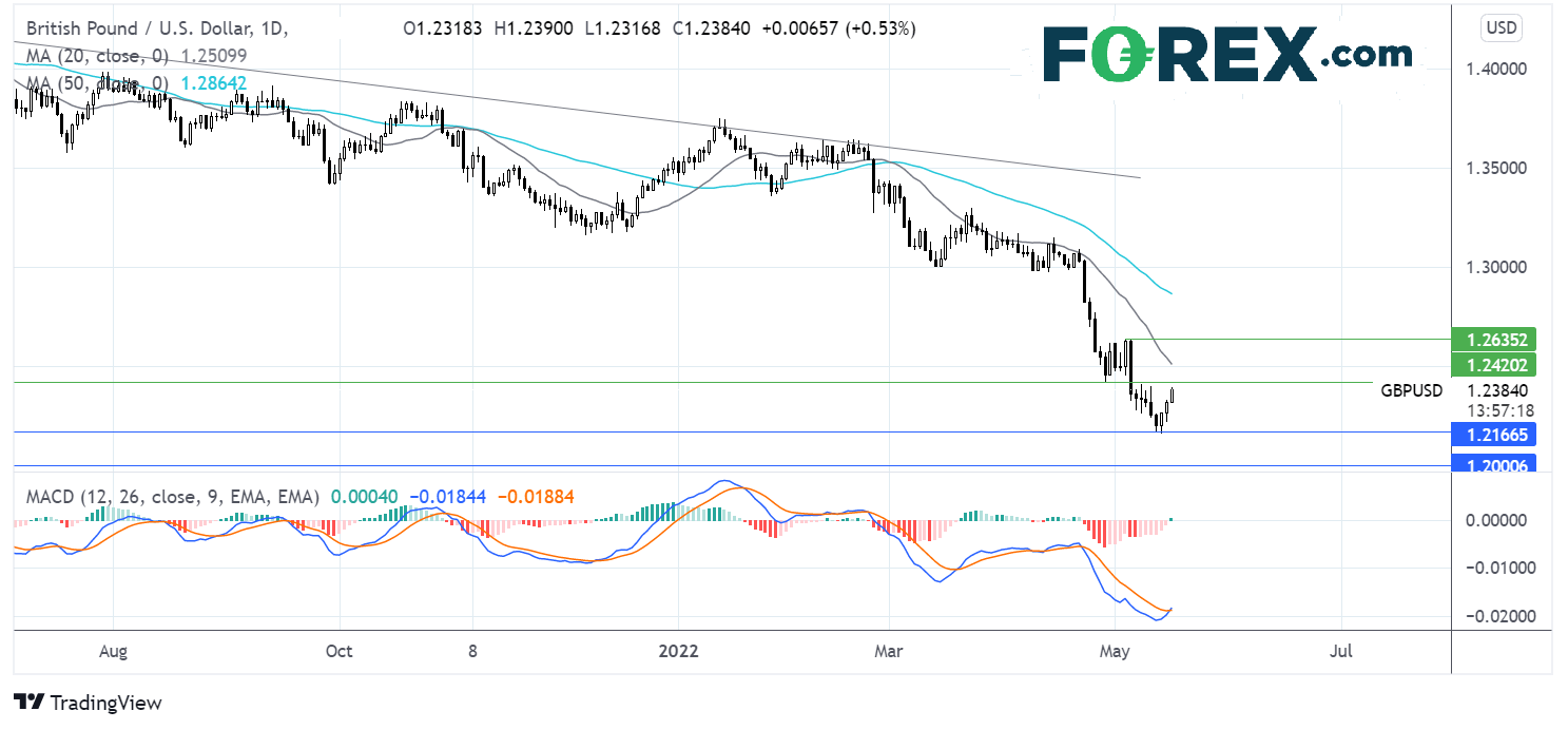 英镑/美元自2022年低点1.2250反弹,至1.23上方。MACD形成金叉,令多头扩大上行的希望不至落空。