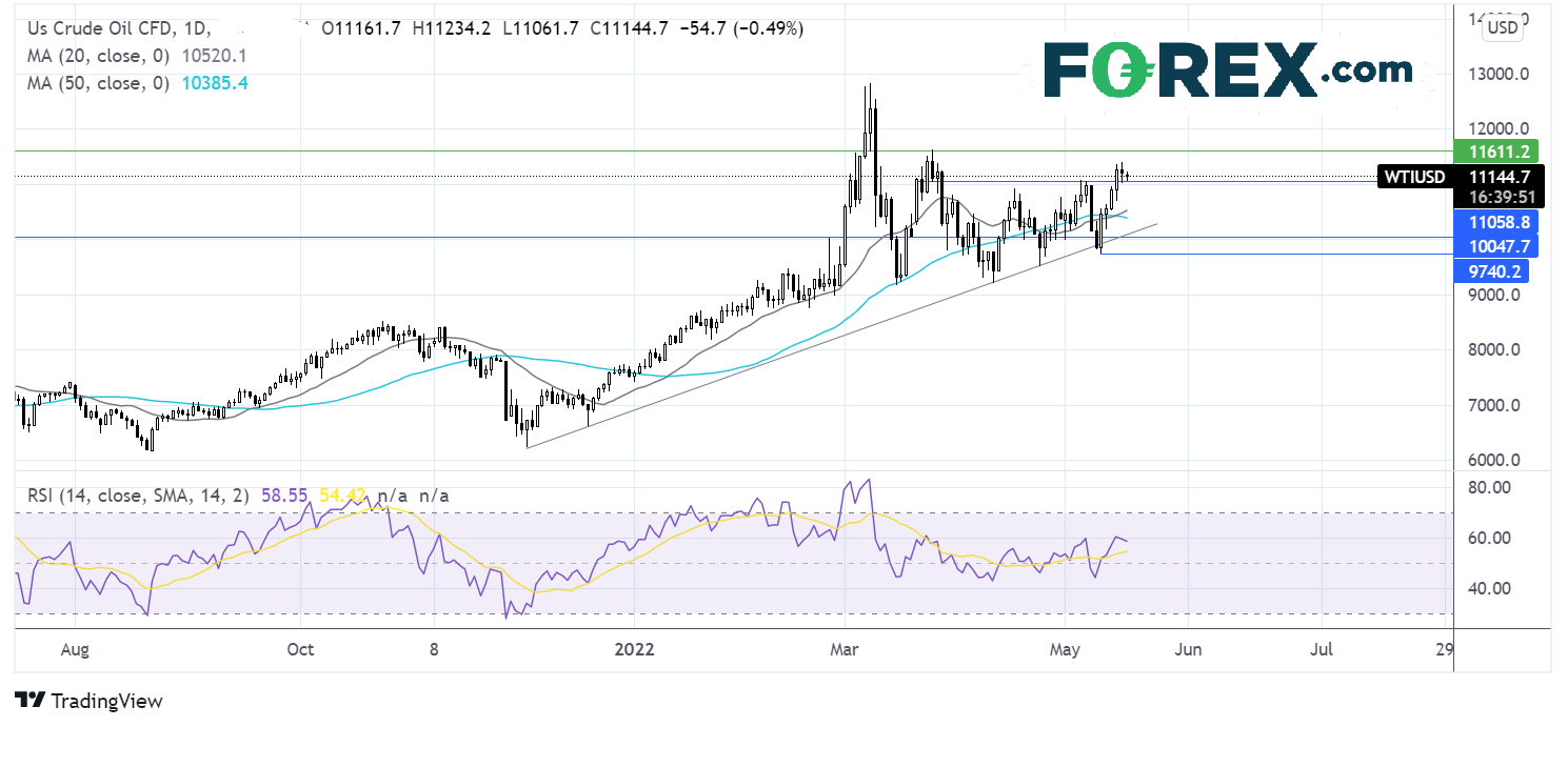 油价扩大了自5月低点97.34以来的反弹势头,收复20和50期均线及110.80的关键阻力位,现使其成为短线支撑位。