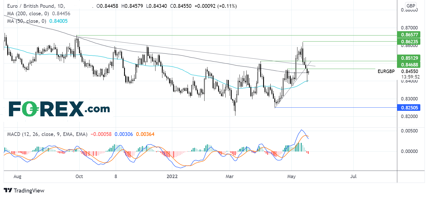 欧元/英镑昨天在50简单均线0.84处企稳,现正测试200简单均线0.8450。未能收复后者,或朝0.84回落,攻克才有机会形成下降的低点。