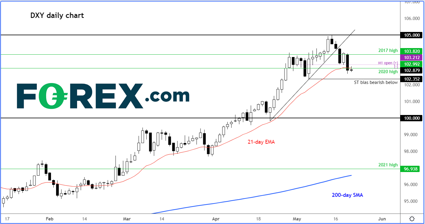 美元指数极可能收低,中断6周连涨势头。如果受制于103.21,则5月迄今月图仍为阴线。叠加月初对2017年高点103.82的突破没有守住,或构成筑顶信号。美元指数也回到2020年高点下方,即103.00之下。所以现在看来,如果受制于103.00,短线技术面趋于下行。