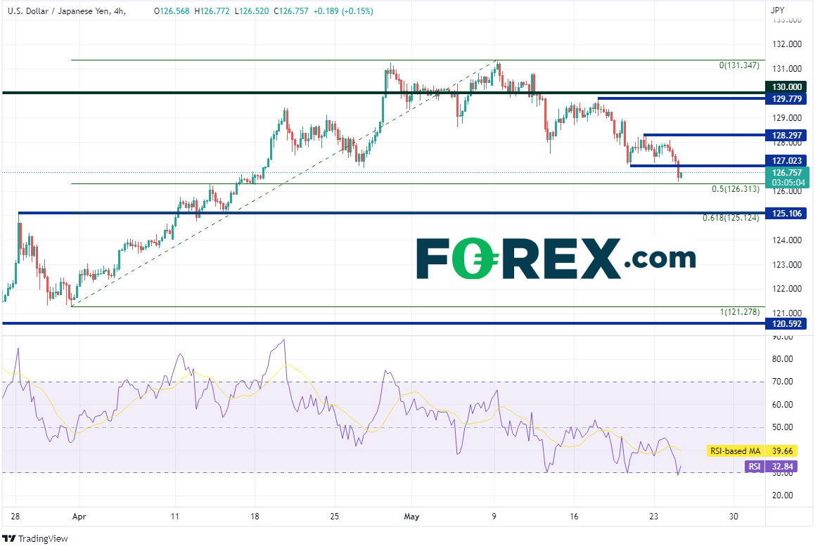 美元/日元4小时图止步于3月31日低点到5月9日高点行情的50%回档位,即126.31附近。要到达头肩顶目标,不仅需要攻克该位,还需要下破水平支撑位和前述行情的61.8%回档位相汇的125.10。