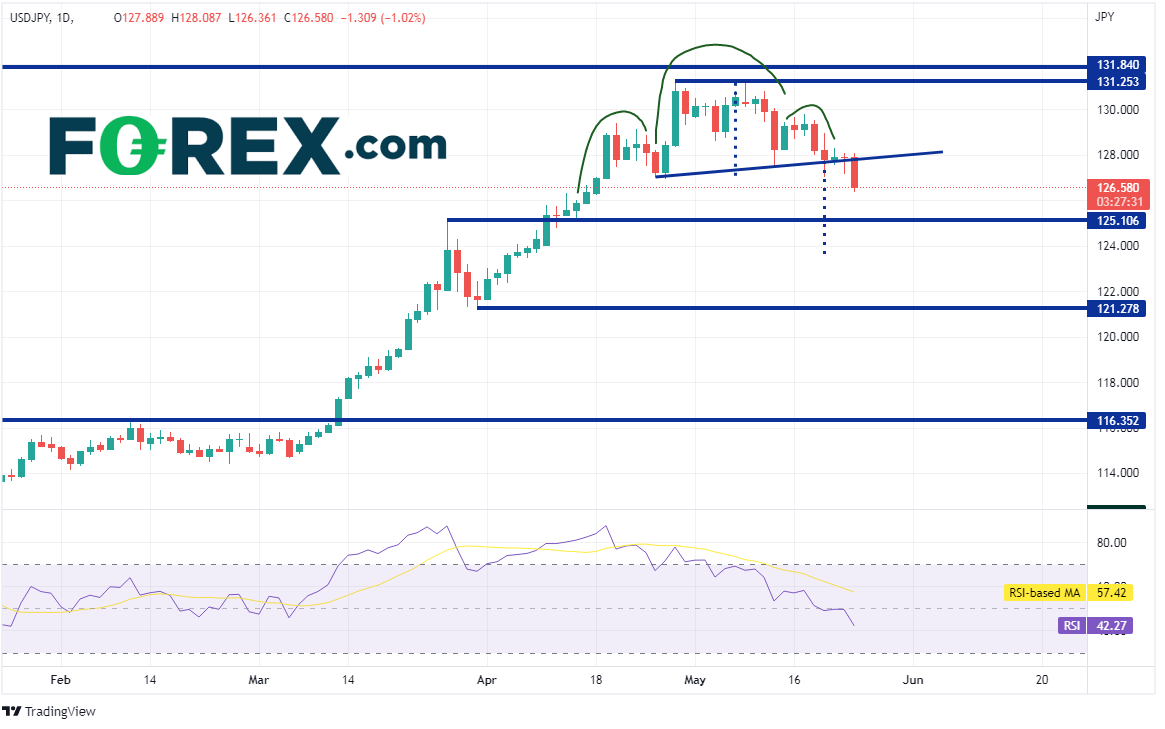 糟糕的楼市数据发布后避险交易紧随而至,美元/日元走弱,一改最近从3月4日114.65低点上涨到5月9日131.25高点的势头。该货币对因此形成头肩顶形态,今天下跌130点子后击穿了形态颈线,正下探形态目标。头肩顶形态的目标为突破位加上头部到颈线的高度,本例中在123.70附近。