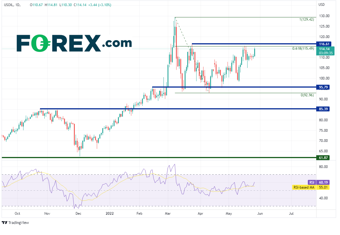 过去数月里油价的上涨也导致制造商无法将成本控制在低位。2月份俄罗斯侵入乌克兰时油价就已处于90一线中轨的高点,后来更是在3月8日暴涨至129.42。油价之后回撤并多次考验95.79附近的突破位支撑,但都守住并促使油价开始再度走高。油价目前正在测试近期高点和3月8日高点到4月11日低点行情的61.8%回档位,即115.50附近。