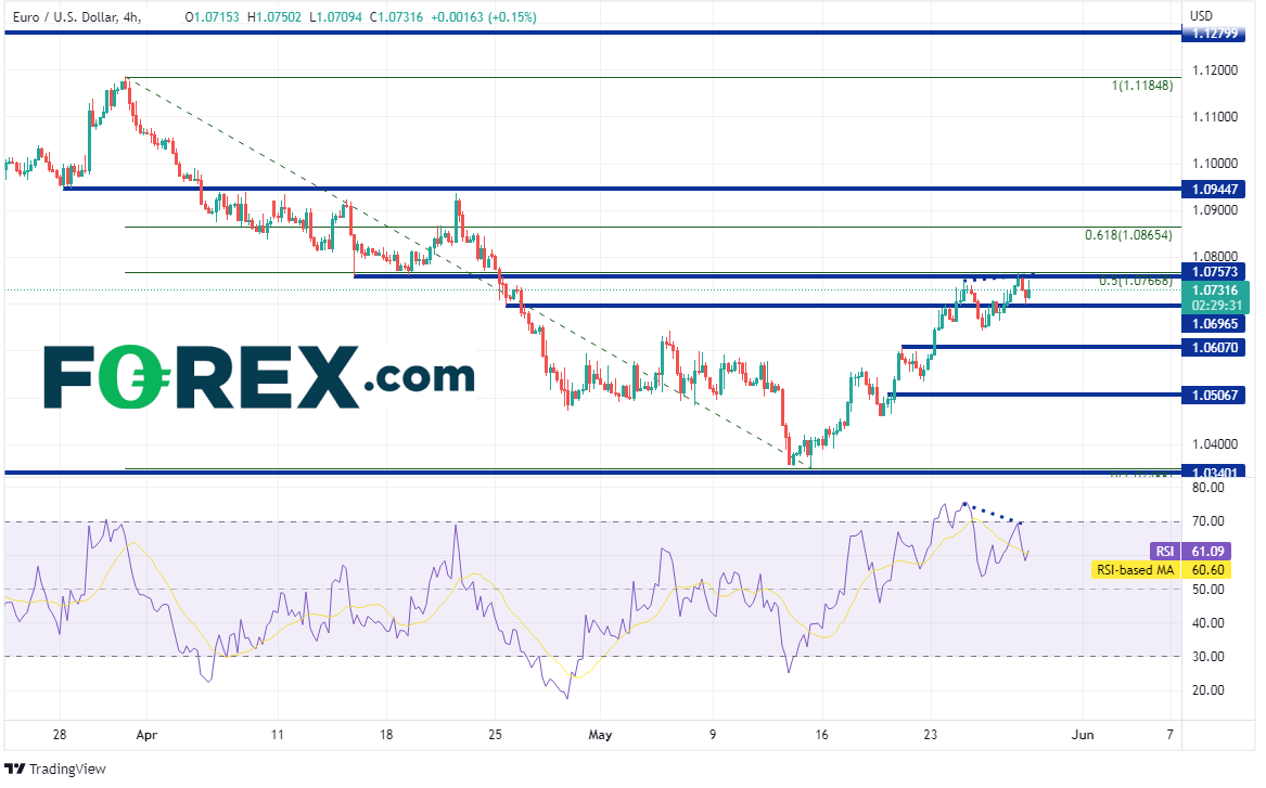 但请注意,欧元/美元4小时图上价格与RSI形成背离,表明价格或准备回调。第一支撑位在5月19日高点1.0607。如果失守,可能先后下看水平支撑位1.0507附近、5月13日低点1.0348附近。