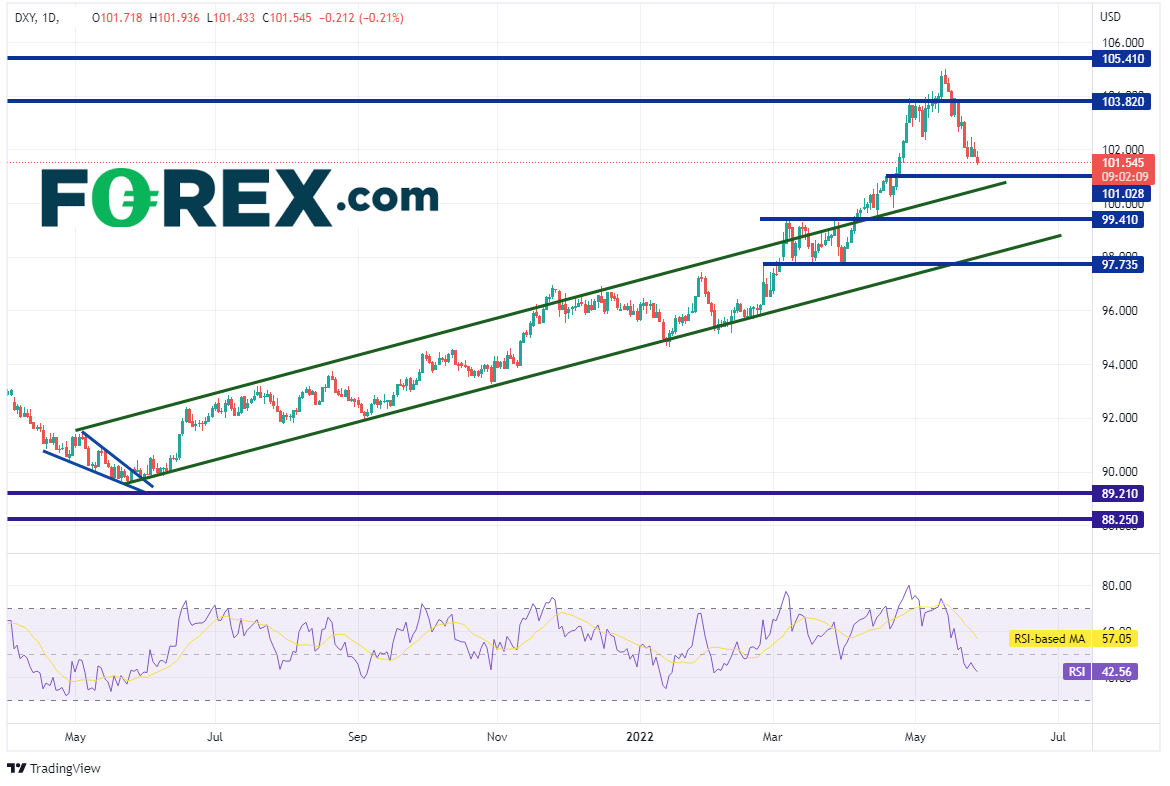 美元指数自2021年5月以来一直交投于一个上斜通道内,于4月5日站上通道上轨后继续马不停蹄地走高,在5月6日攻克2017年1月高点,5月8日上攻105.00高点。自那以后不断回撤,目前逼近日图支撑位101.03。